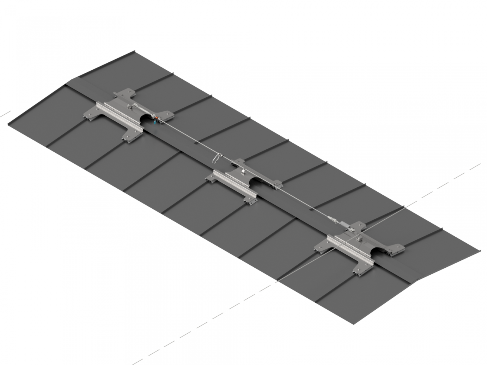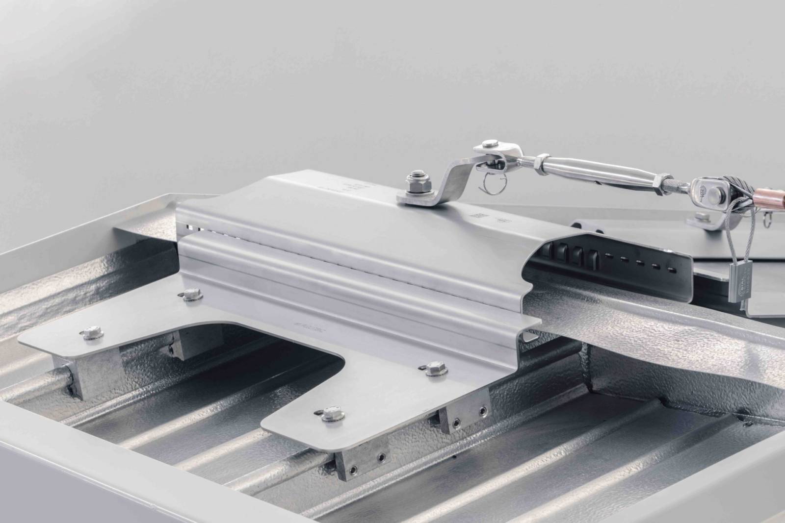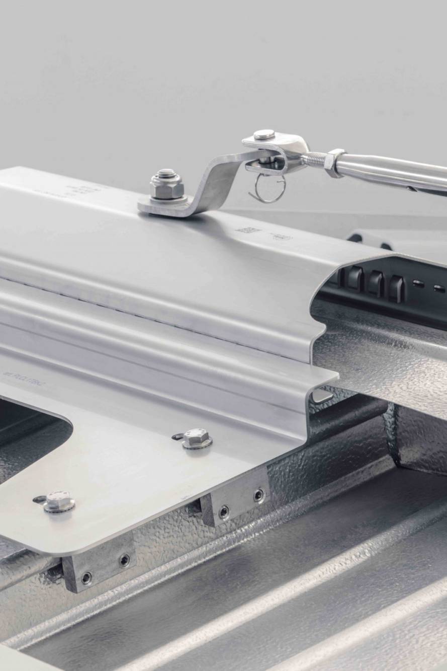 Sistema di ancoraggio conforme EN 795 / CEN TS 16415 / UNI 11578 tipo C da installare sopra colmo di copertura metallica con lamiera aggraffata per mezzo di speciali grani INOX.