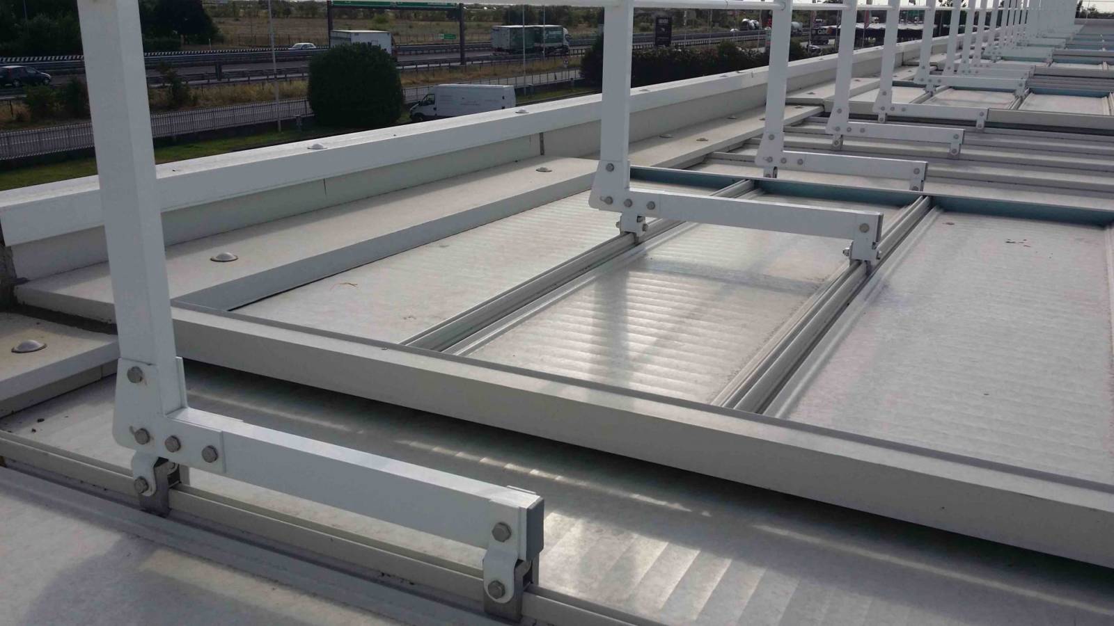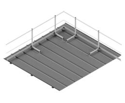 Il parapetto SICURGUARD® SGRK conforme EN 14122-3 consente, grazie alle basi applicative corredate di speciali morsetti in alluminio brevettati da SIAL SAFETY® il fissaggio dei montanti sopra lamiera Riverclack® – Rivergrip ®.
