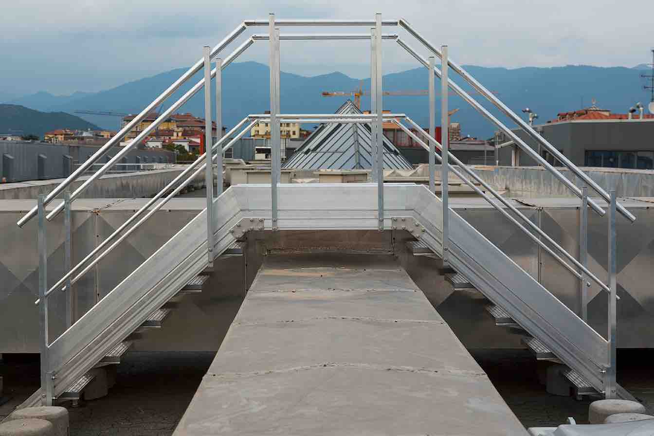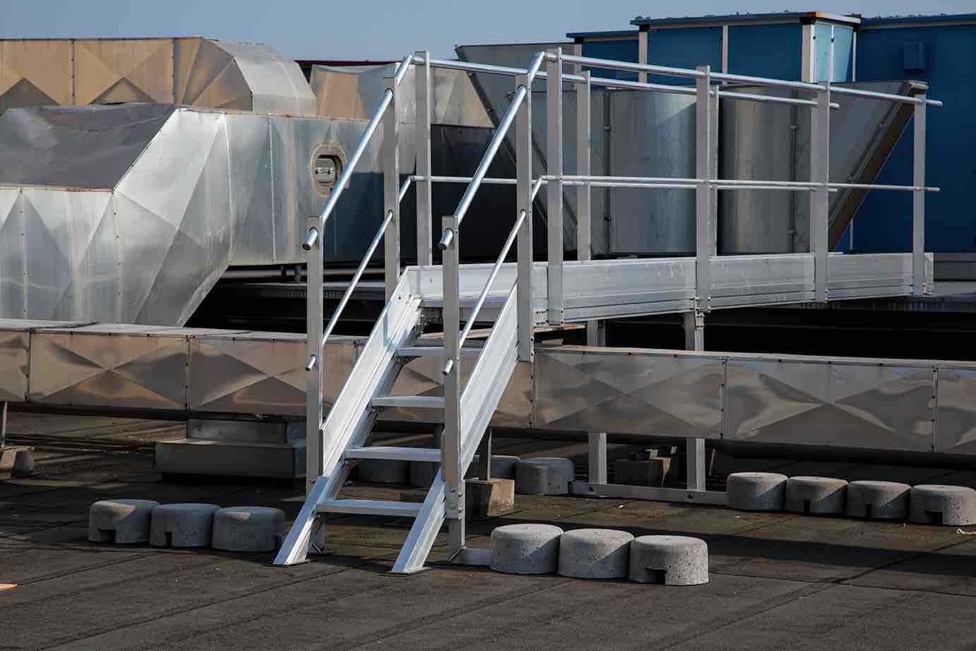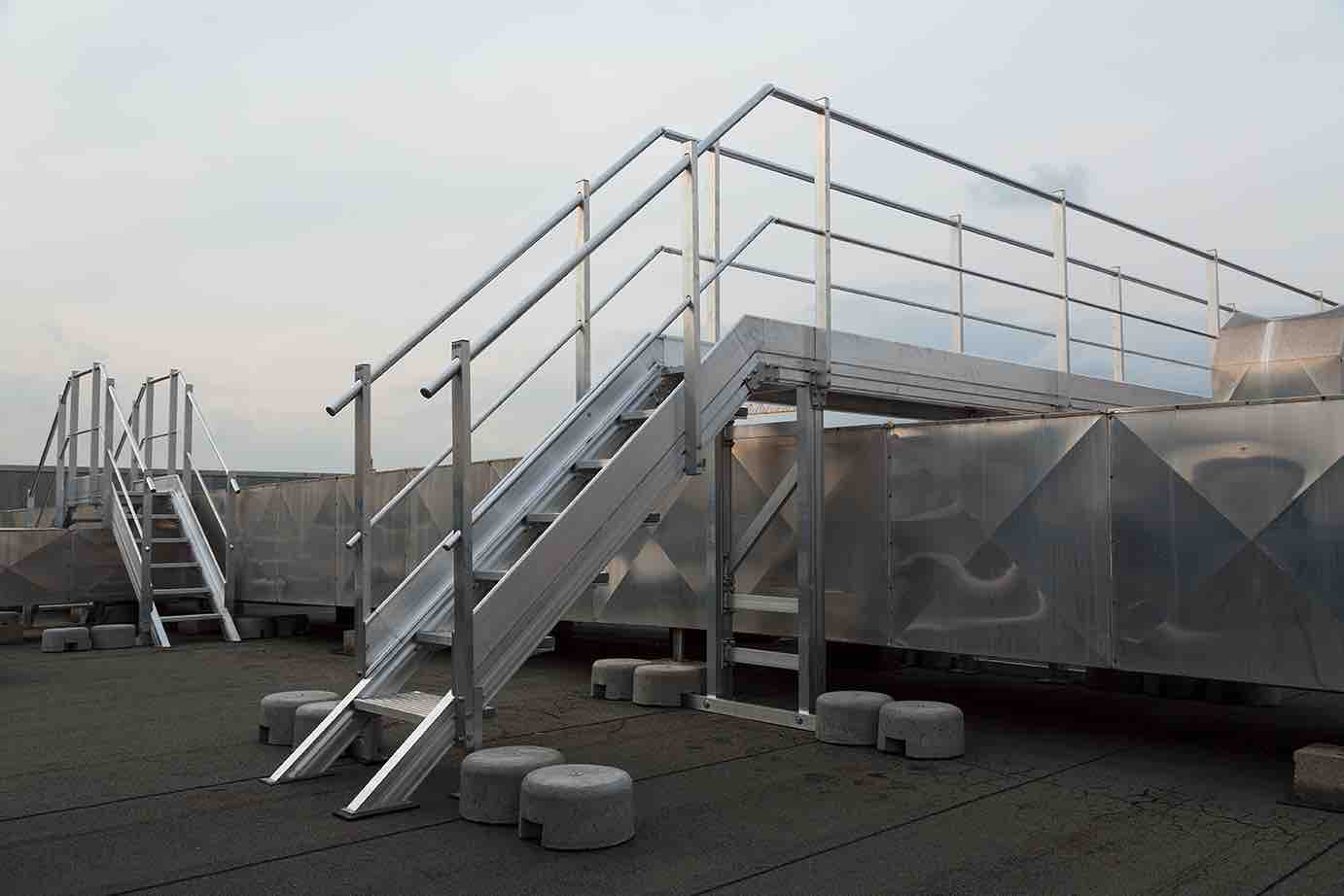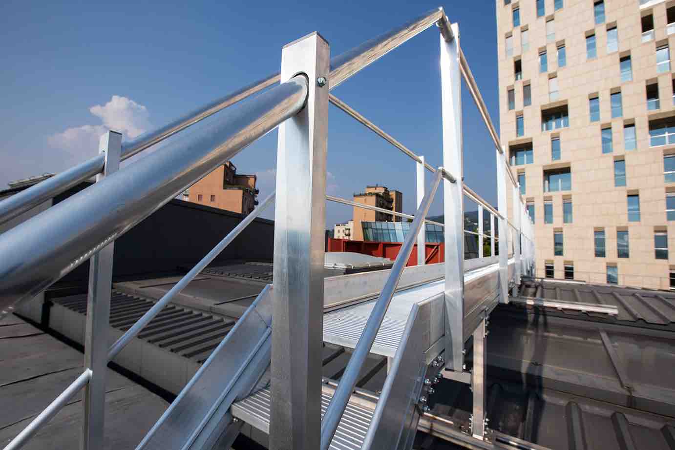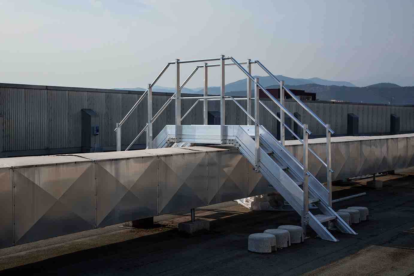 La passerella SICURGUARD® WALK con parapetto laterale è assemblabile nella configurazione per creazione di scale a ponte per scavalcamento. La modularità dei componenti, la leggerezza dei materiali in alluminio e la semplicità di assemblaggio facilitano le operazioni di posa, consentendo di ottenere percorsi di sicurezza a costi contenuti e con una resa estetica decisamente appagante.