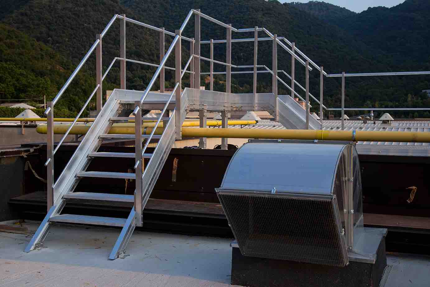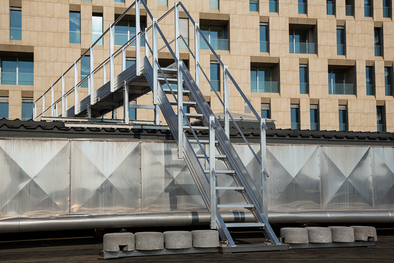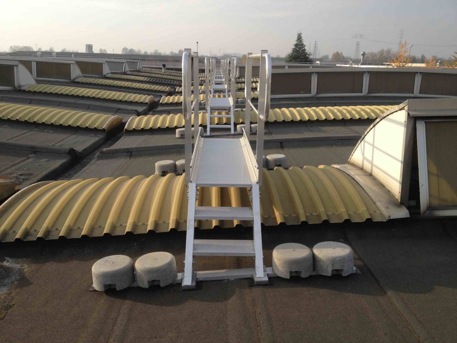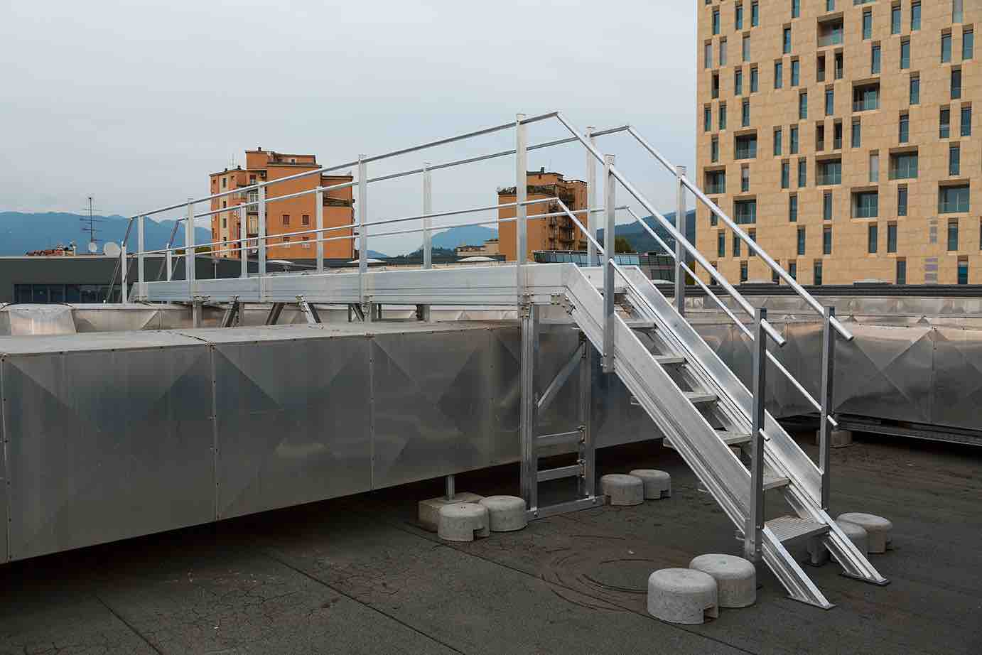 La passerella SICURGUARD® WALK con parapetto laterale è assemblabile nella configurazione per creazione di scale a ponte per scavalcamento. La modularità dei componenti, la leggerezza dei materiali in alluminio e la semplicità di assemblaggio facilitano le operazioni di posa, consentendo di ottenere percorsi di sicurezza a costi contenuti e con una resa estetica decisamente appagante.